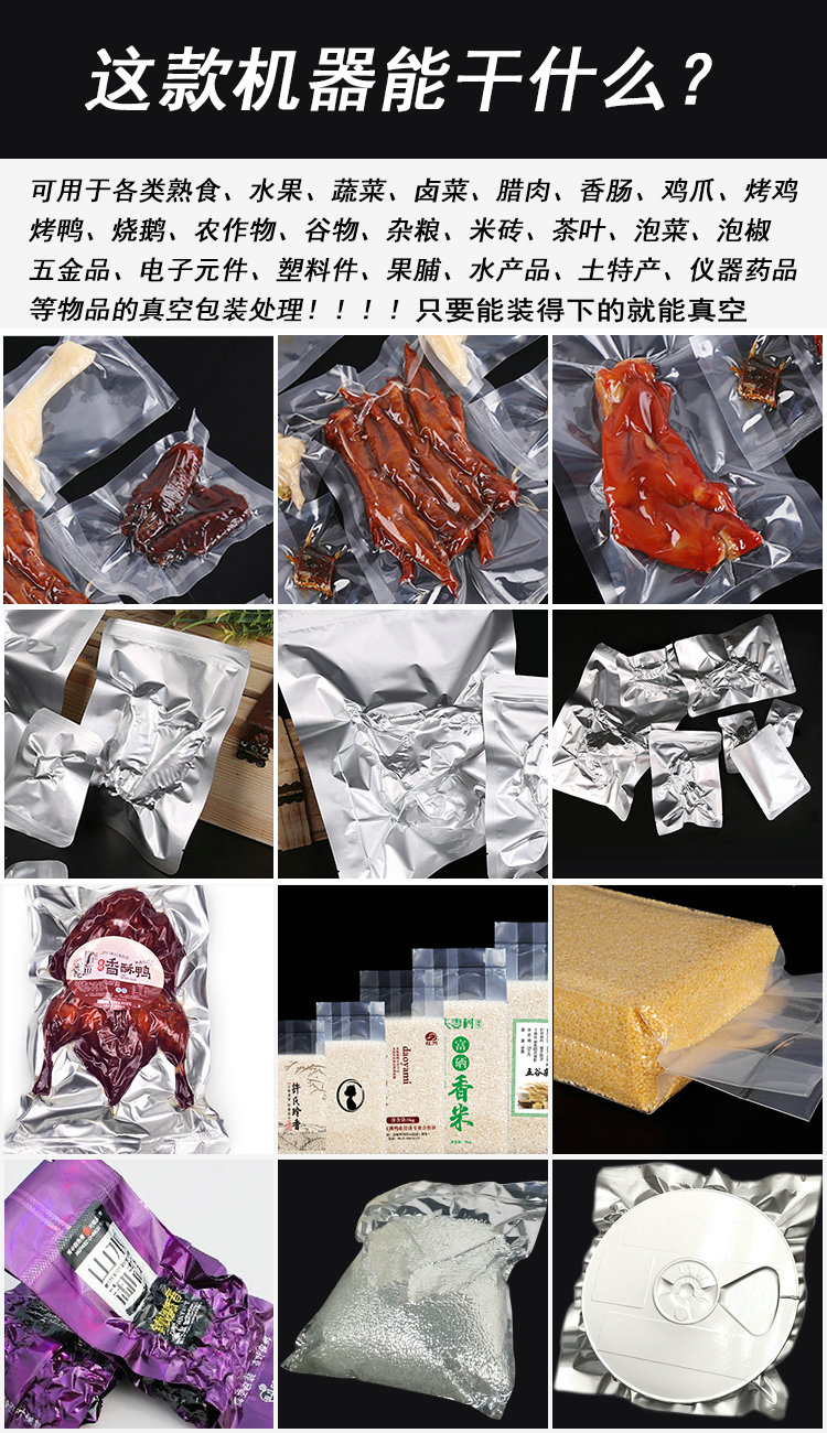 5.臺式真空包裝機(jī)使用不銹鋼材料制作,防腐防潮,可以適應(yīng)比較差的生產(chǎn)環(huán)境;保證了機(jī)械的美觀性,延長了機(jī)械的使用壽命。